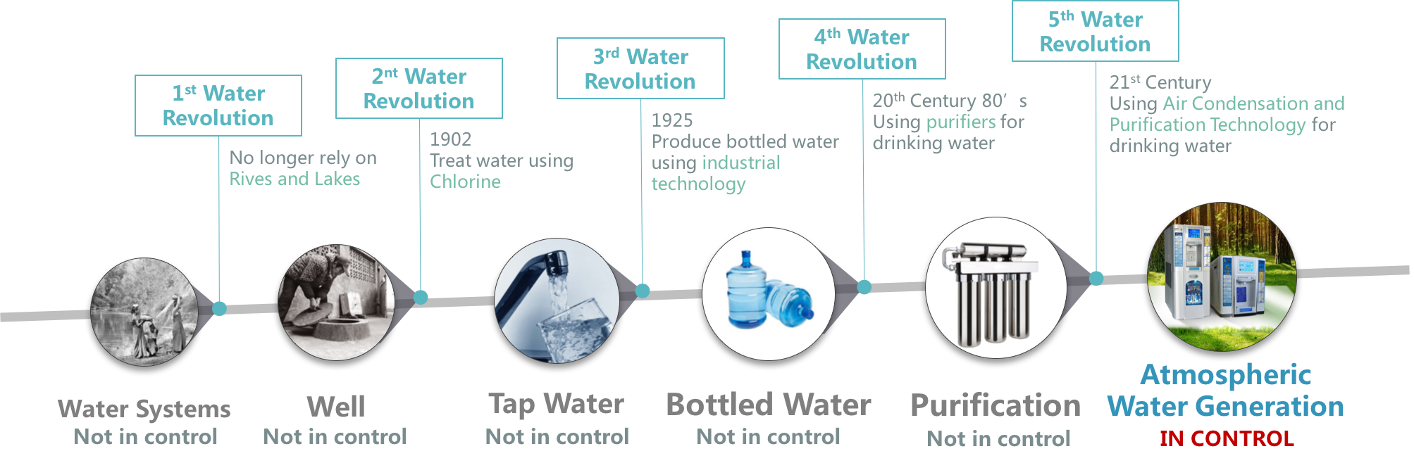 For thousands of years, we have been collecting and extracting water resources, mostly from surface and underground. With the technology advancement, we started to have water supply systems, bottled water, water purifier and etc. However, we yet had control over water resources. Now, with this revolutionary atmospheric water generation, it will be the first time in our history that we have water resource truly in our hand.